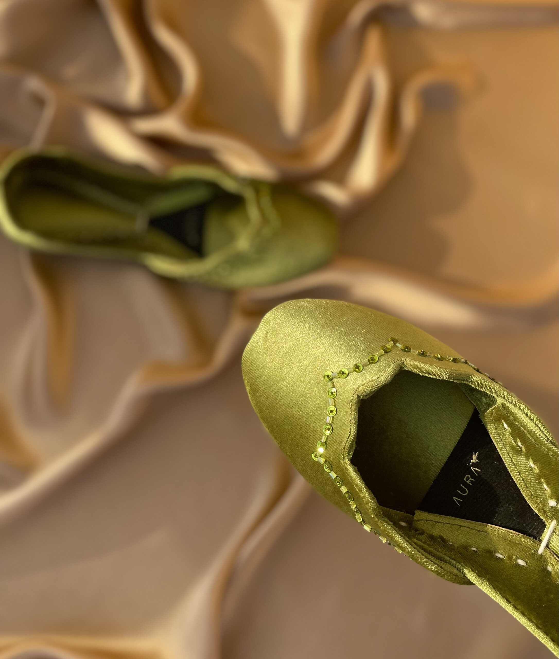 Bliss pear green is a unique hue adorned finely with green dhaaga and sitaara. Perfect fit to show ethnicity and uniqueness. Easy to wear carefully handcrafted khussa. Available in all sizes so, order now this elegant pair.
