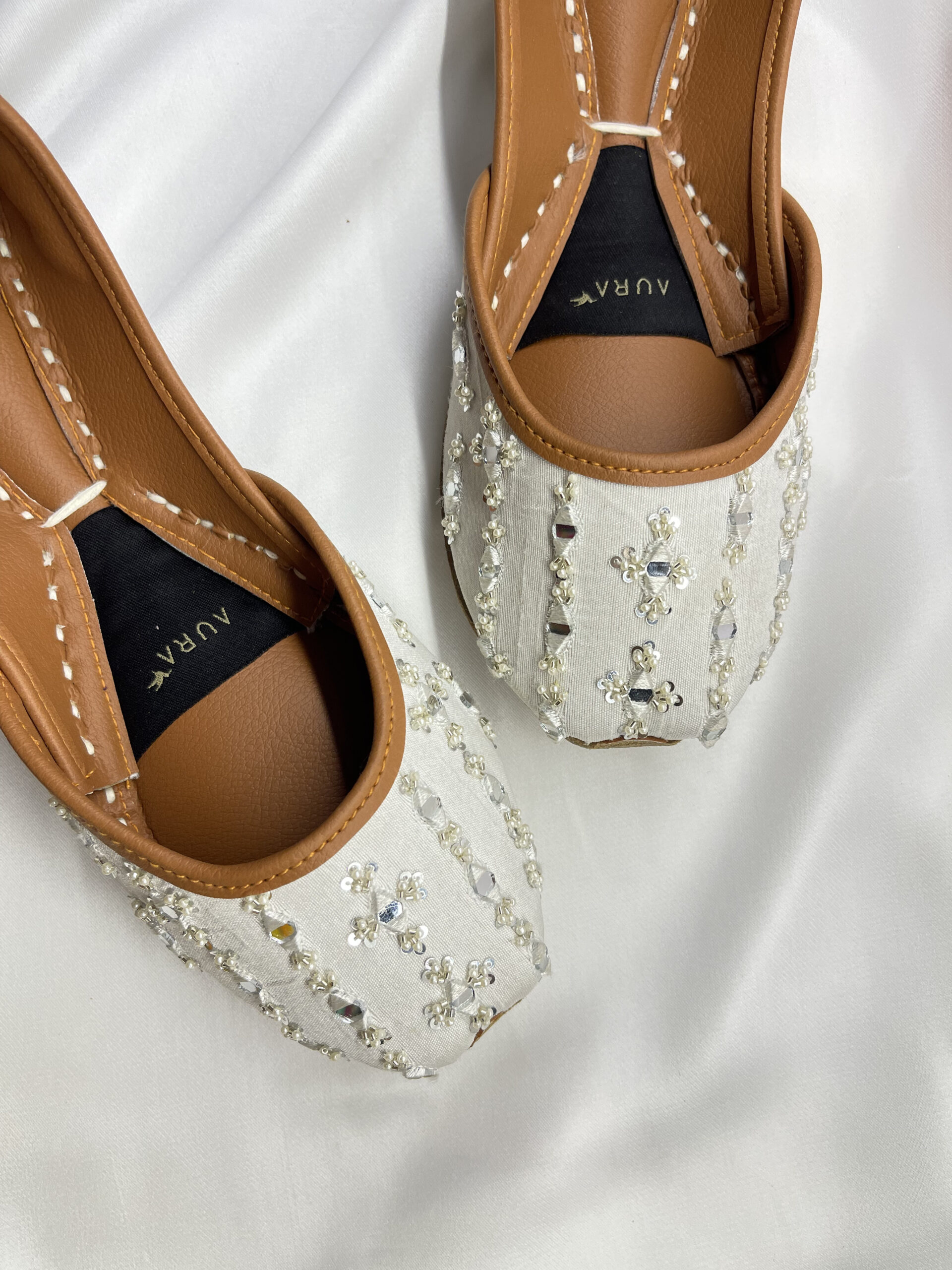 Hirni white a silverish hue, is duly complemented with white pearls, fine silver treads, sheesha, cut dana and sequin. Excellent choice for light-coloured dresses and special occasions.Â