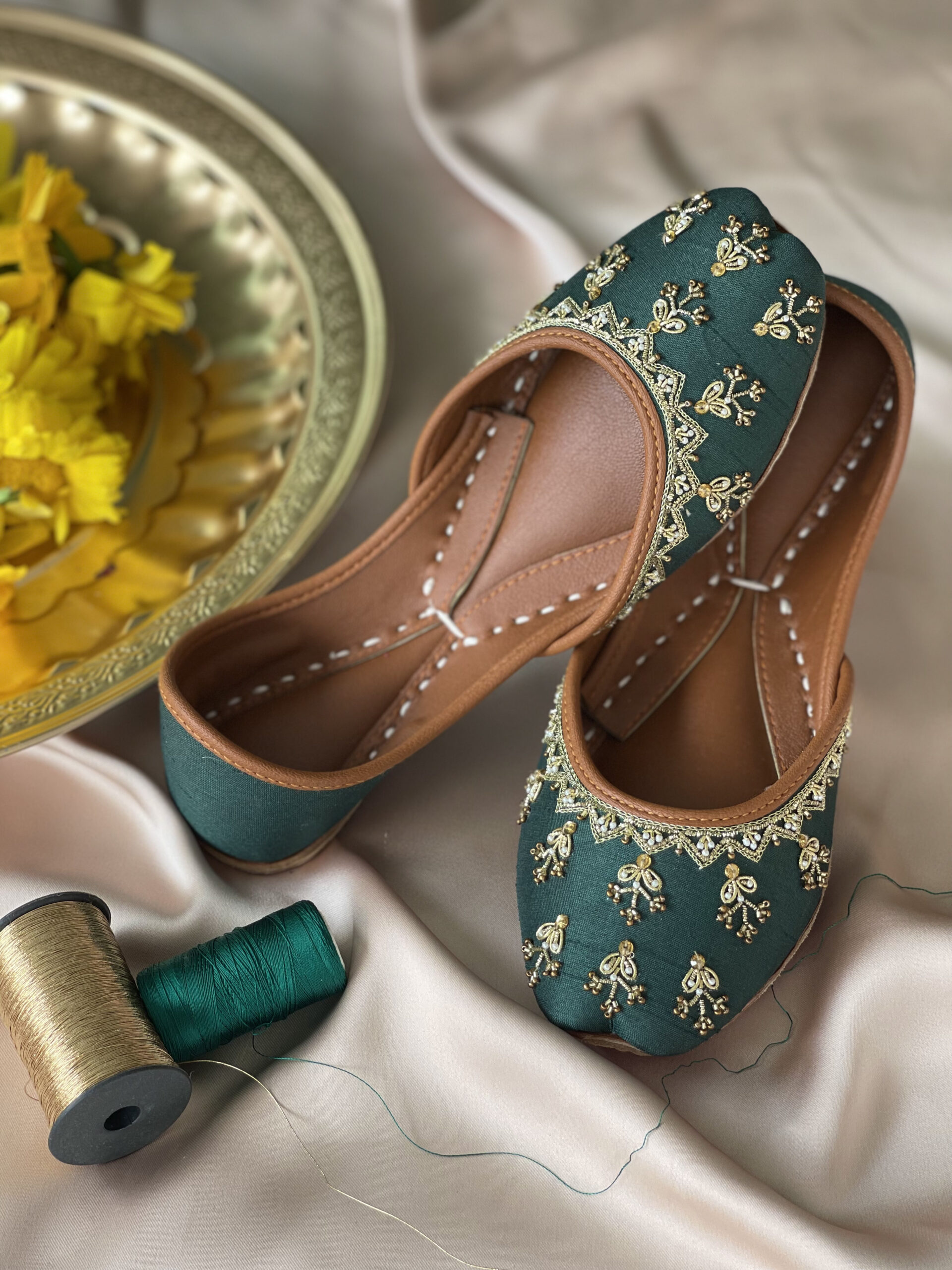 Morni our premium product, a zinc green hue adorned with golden thread and small pearl accents. This hand made decorative pair ensures comfortable and attire walking.Â